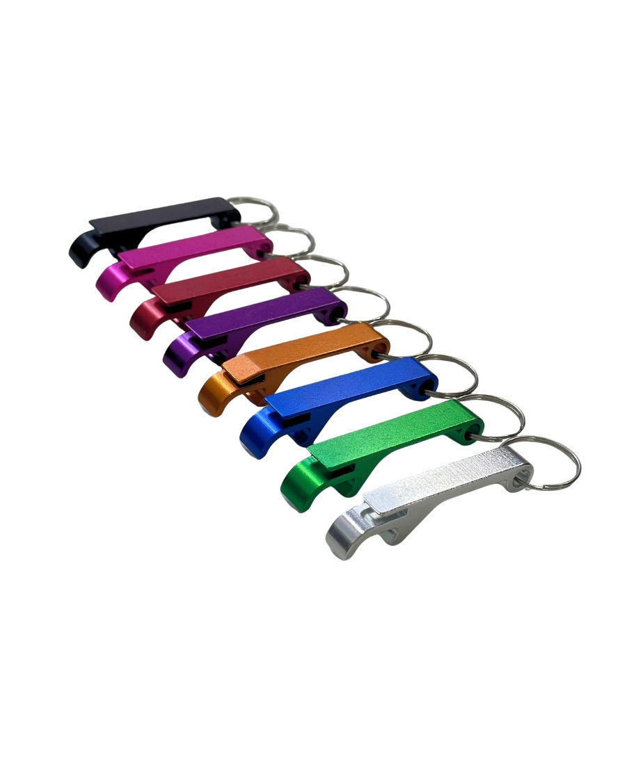 Chaveiro abridor multifuncional em metal, eficiente para garrafas e latinhas na medida certa para a abertura de refrigerantes ou cervejas de maneira simples.